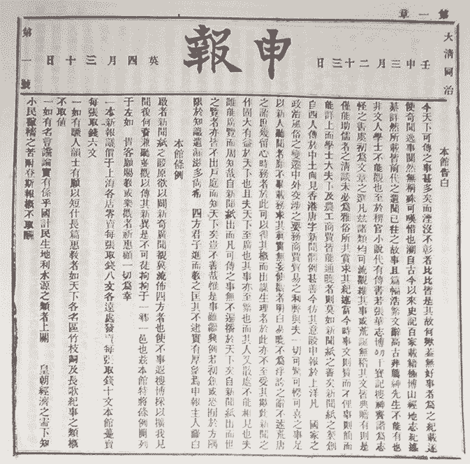1872年4月30日,中國(guó)第一張近代報(bào)紙《申報(bào)》在上海創(chuàng)刊。