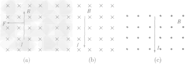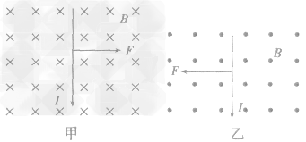比較圖(a)、(b):磁感線方向相同,都是垂直紙面向里,電流方向相反,受磁場力方向也應相反,(a)圖向左,則(b)圖向右。