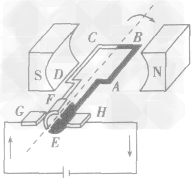 | 換向器 | (1)構造:由兩個銅制半球環(huán)構成 (2)作用:能自動地改變線圈中的電流方向,使線圈能連續(xù)轉動 |