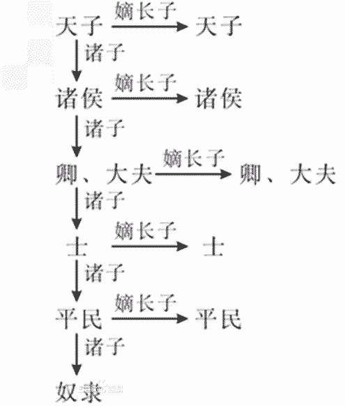 以血緣關(guān)系為基礎(chǔ)的,核心是嫡長(zhǎng)子繼承制。周王自稱(chēng)“天子”,王位由嫡長(zhǎng)子繼承,世代保持天下同姓“大宗”的地位。諸侯在其封國(guó)內(nèi)為大宗,君位也由嫡長(zhǎng)子繼承,其余諸子分封為卿、大夫,各位小宗,但在本宗內(nèi)的各個(gè)分支中又處于大宗地位。