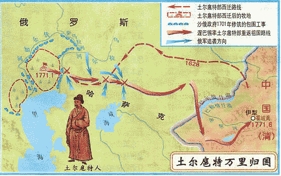 乾隆三十六年(1771年),土爾扈特部首領渥巴錫(阿玉奇汗之曾孫)為擺脫沙俄壓迫,維護民族獨立,率領部眾發動了武裝起義,并沖破沙俄重重截擊,歷經千辛萬苦,勝利返回祖國。土爾扈特部的回歸為鞏固中華統一的多民族國家,寫下了可歌可泣的光輝篇章。