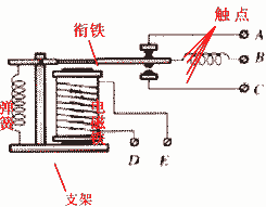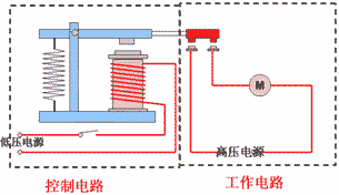 電磁鐵通電時(shí),把銜鐵吸下來(lái),使動(dòng)觸點(diǎn)和靜觸點(diǎn)接觸,工作電路閉合,電磁鐵斷電時(shí),電磁鐵失去磁性,彈簧把銜鐵拉起來(lái),切斷工作電路。