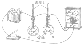(2)B瓶中溫度計升高得快,說明相同時間內(nèi)煤油吸收的熱量多,由于鎳鉻合金絲電阻大于銅絲電阻,所以在電流和通電時間相同時,導體電阻越大,產(chǎn)生的熱量越多。
