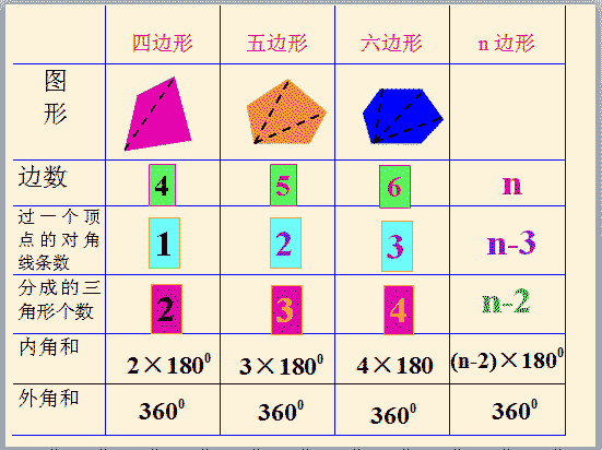n邊形的內(nèi)角和等于(n-2)·180°。(多邊形內(nèi)角和定理)