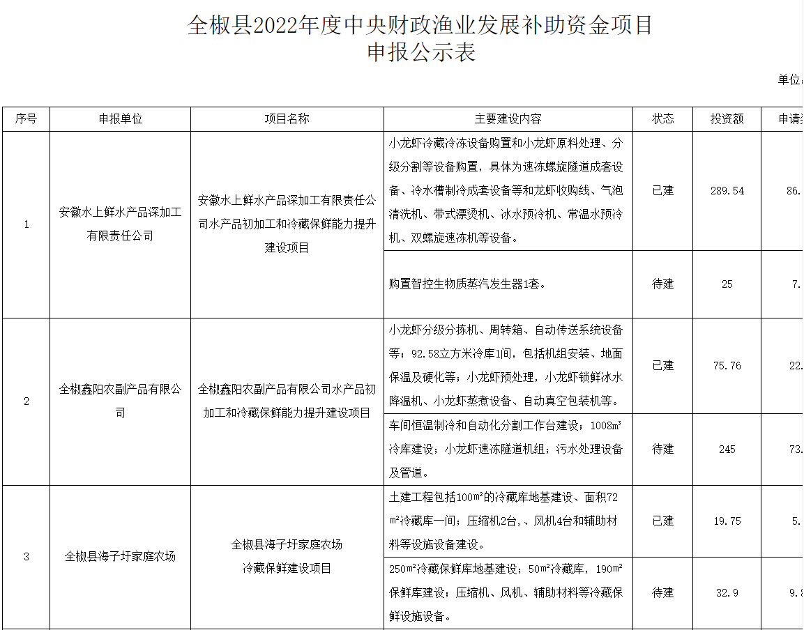 關于全椒縣2022年度中央財政漁業發展補助資金項目申報的公示