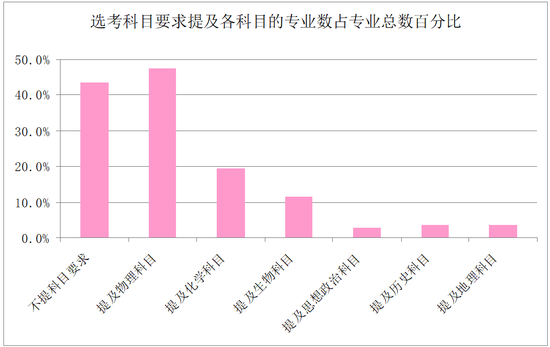 選考科目要求提及各科目的專業(yè)數(shù)占專業(yè)總數(shù)百分比如下圖所示: