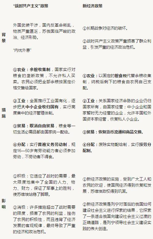 新經(jīng)濟(jì)政策實(shí)施的標(biāo)志:1921年3月,俄共(布)第十次全國(guó)代表大會(huì)的召開標(biāo)志著蘇俄開始由戰(zhàn)時(shí)共產(chǎn)主義政策向新經(jīng)濟(jì)政策過渡(通過"固定的糧食稅取代余糧收集制")。