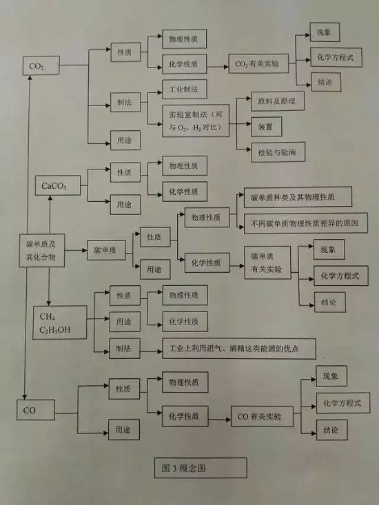 例如,在復習碳和碳的氧化物中,可構(gòu)以下概念圖: