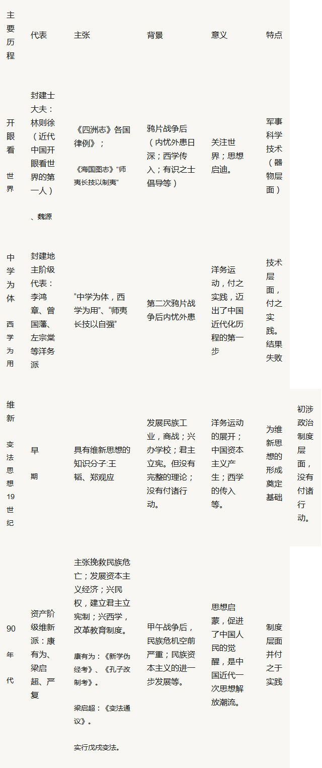中國(guó)近代思想發(fā)展的核心是向西方學(xué)習(xí),縱向分析可分成三個(gè)階段和層次: