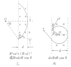 來判定轉(zhuǎn)過的圓心角度、運動時間等極值問題,其中l是最遠點到入射點間距離即軌跡上的弦長。