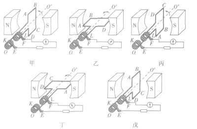 如圖所示表示了線圈ABCD在磁場中逆時針轉(zhuǎn)動一周的情況。前半周(甲→乙→丙)電流沿著DCBA方向流動(由右手定則分別判斷ABCD邊切割磁感線,而AD、BC邊不切割磁感線),后半周(丙→丁→戊)電流方向為ABCD,兩種情況交替出現(xiàn),形成交變電流。