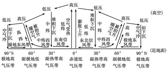 (1)從氣壓帶來看,全球七個(gè)氣壓帶是高低相間分布的,且以赤道為軸南北對(duì)稱分布。