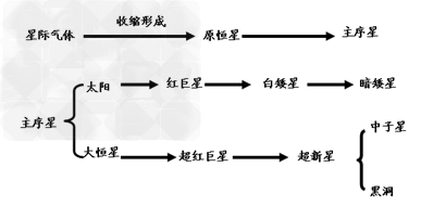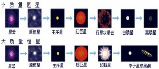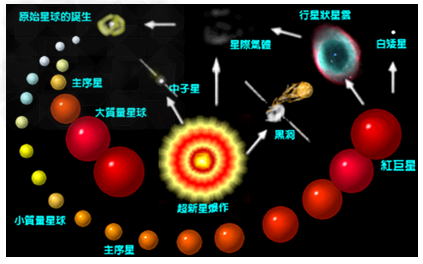 原恒星 → 主序星 → 紅巨星 → (超)新星 → 中子星(行星狀星云)→ 黑矮星