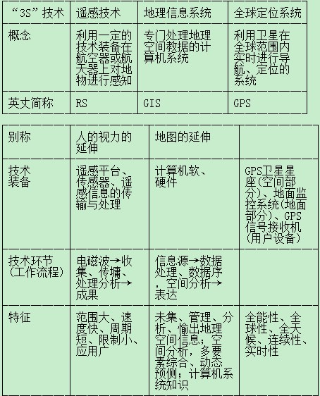 在做“3S”技術(shù)中選取適當(dāng)手段之類的題目時,首先看其工作對象是“點”還是“面”,是“點”則選用GPS,如導(dǎo)航、珠峰高度測最等,如果是“面”則需看突出監(jiān)測方面還是需處理計算才能得出結(jié)果,如要監(jiān)測森林火災(zāi)則應(yīng)選用RS技術(shù),要在某城市選取大型商業(yè)中心區(qū)位應(yīng)選用GIS技術(shù)。同時,一項工作往往可能在某次使用的是一種技術(shù),而另一次則使用了另一種技術(shù),甚至是同時使用了多種技術(shù),因此要認(rèn)真審清題目,提煉題目中提供的信息。如“某山區(qū)森林火災(zāi)發(fā)生后,撲救工作動用了衛(wèi)星監(jiān)測定位,并運(yùn)用計算機(jī)軟件對火勢情況進(jìn)行了分析和預(yù)報”這一事件中,使用衛(wèi)星監(jiān)測是RS技術(shù)的應(yīng)用,衛(wèi)星定位則是GPS技術(shù)的應(yīng)用,計算機(jī)處理預(yù)報信息則是GIS技術(shù)的應(yīng)用。