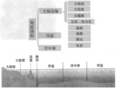 從大陸邊緣到大洋中心,海底地形分成大陸架、大陸坡、洋盆和洋中脊等主要類(lèi)型。