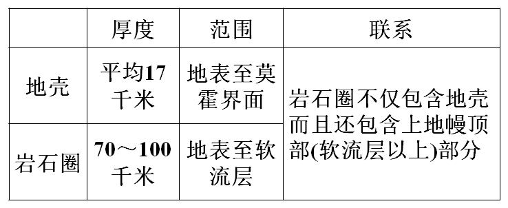 | 地殼 | 莫霍面以上 | 固態(tài):平均厚度17千米(大陸部分平均厚度約33千米,海洋部分平均厚度約為6千米)。地勢(shì)越高,地殼越厚。 |
