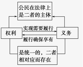 (2)公民在法律上既是權(quán)利的主體又是義務(wù)的主體;權(quán)利的實現(xiàn)需要義務(wù)的履行,義務(wù)的履行確保權(quán)利的實現(xiàn)。