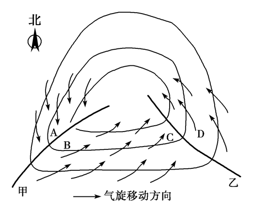 ③天氣:兩個(gè)鋒面附近氣流上升強(qiáng)烈,往往產(chǎn)生云、雨、雪,甚至造成雷雨、暴雨、暴雪、大風(fēng)降溫等天氣。甲鋒面附近的降雨主要在A處,而乙鋒面附近的降水主要在D處。