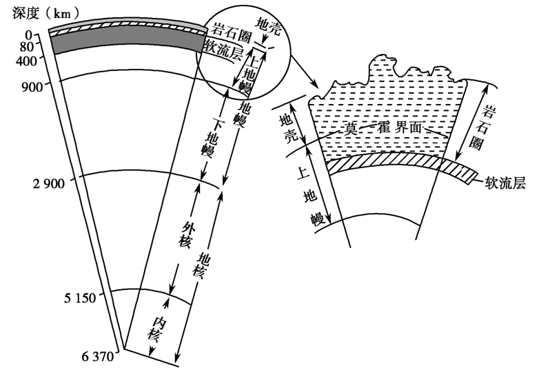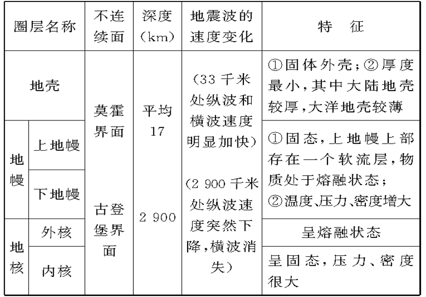 地震波在地球內(nèi)部傳播速度的變化,地球固體表面以下可劃分為地殼、地幔、地核三個(gè)圈層。具體分析如下圖表所示: