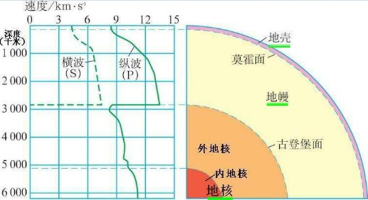地震波內(nèi)部與地球內(nèi)部構(gòu)造圖: