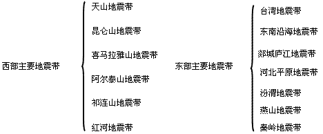 (1)我國地震的基本特點(diǎn):分布范圍廣;頻率高,強(qiáng)度大;震源淺,危害大。