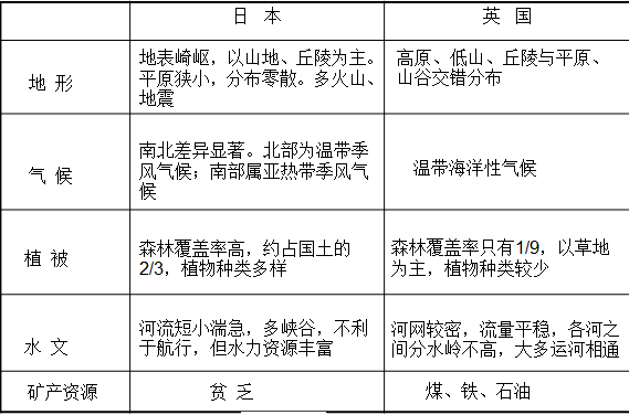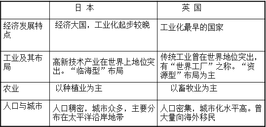 (1)相似性:工業(yè)在國民經(jīng)濟中都占重要地位,工業(yè)比較發(fā)達,都充分利用島國多港灣的優(yōu)勢發(fā)展本國工業(yè)。