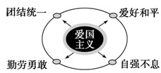 以愛(ài)國(guó)主義為核心,團(tuán)結(jié)統(tǒng)一、愛(ài)好和平、勤勞勇敢、自強(qiáng)不息。