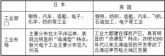 (1)相似性:工業(yè)在國(guó)民經(jīng)濟(jì)中都占重要地位,工業(yè)比較發(fā)達(dá),都充分利用島國(guó)多港灣的優(yōu)勢(shì)發(fā)展本國(guó)工業(yè)。