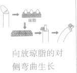 | 把沒有接觸過胚芽鞘尖端的瓊脂塊放在切去尖端的胚芽鞘切面的一側(cè) | ![]() | ||