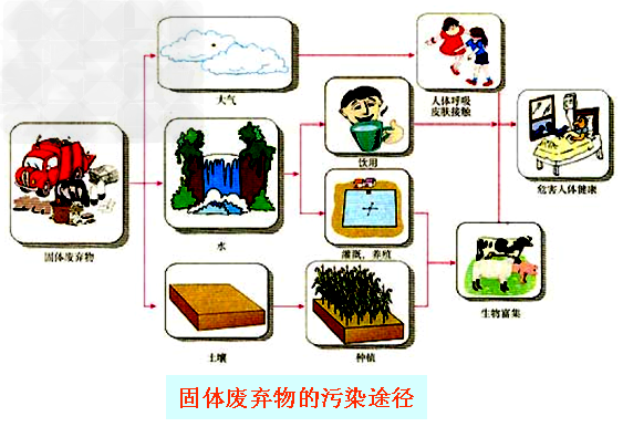 | 污染土壤 | 固體廢棄物露天堆放占用大量土地;其中有害成分通過風化、淋溶、徑流侵蝕形成毒液進入土壤中,造成土壤酸化、堿化、毒化,從而破壞土壤中微生物的生存條件; 有害成分在動植物體內(nèi)積蓄,通過食物鏈危害人體健康 |