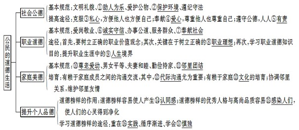 | 踐行途徑 | ①有賴于家庭成員之間的溝通交流。②有賴于家庭文化的培育。③是協(xié)調(diào)鄰里關(guān)系的情感基礎(chǔ) | ①樹立正確的職業(yè)價(jià)值觀念。②樹立正確的職業(yè)理想。③學(xué)習(xí)職業(yè)道德知識(shí) | ①克服私心,方便他人也方便自己。②奉獻(xiàn)愛心,尊重他人也尊重自己。③遵守公德,人人有責(zé) |