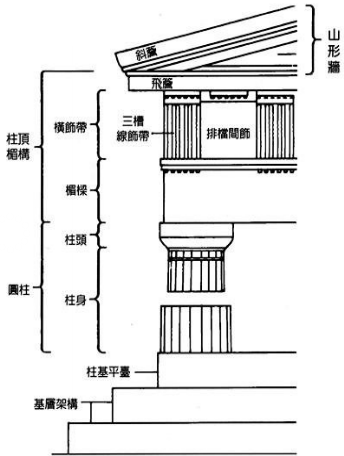 神廟坐西朝東,外形呈長方形,長228英尺,寬101英尺,由46根多立克式立柱環(huán)繞構(gòu)成柱廊,長邊方向每邊17根,短邊方向每邊8根。帕特農(nóng)神廟的正立面的各種比例尺度一直被作為古典建筑的典范,柱式比例和諧,很多地方經(jīng)后人測量,發(fā)現(xiàn)出現(xiàn)的長方形的長寬比例很多都是接近于黃金比的,視覺校正技術(shù)運(yùn)用純熟,山花(也就是山形墻)雕刻豐富華美。