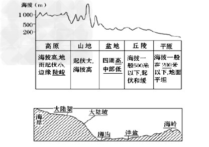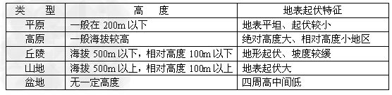 地形特點:一般從海拔、起勢起伏、地形的種類和分布等方面說明