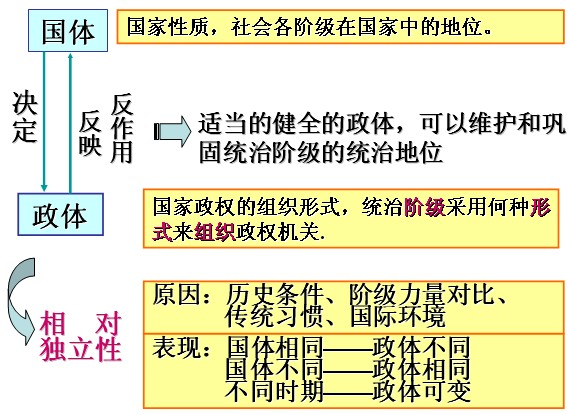 | 區(qū)別 | 國體即國家性質(zhì),反映社會各階級在國家中的地位。統(tǒng)治階級的性質(zhì)決定著國家的性質(zhì) | 政體即國家管理形式,是國家政權(quán)的組織形式 |