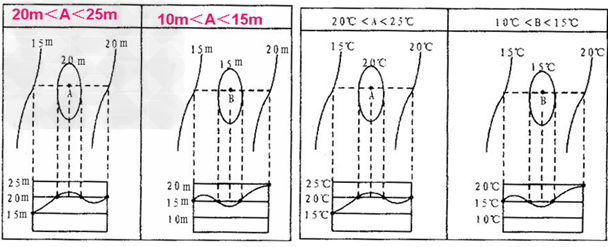 海洋冬季 | 氣溫高 | 向高緯凸出 | 海洋夏季 | 氣溫低 | 向低緯凸出 |