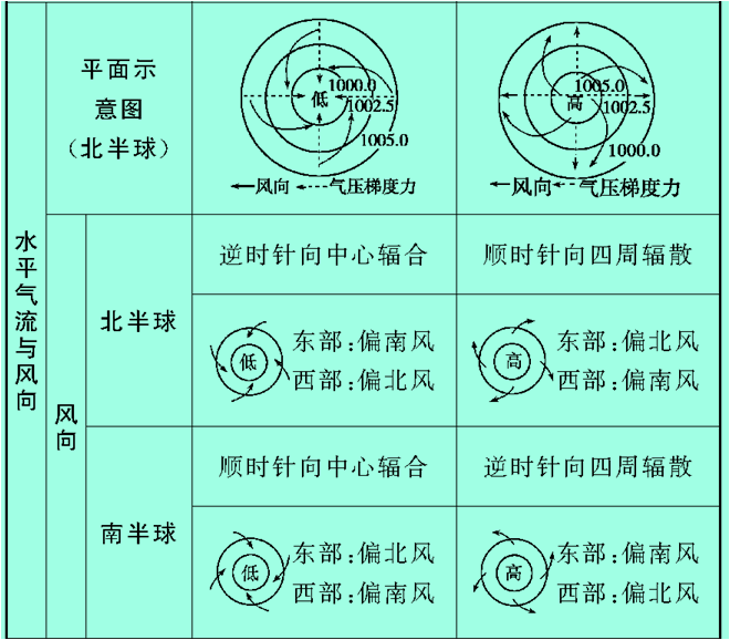 判定風(fēng)向規(guī)律:先明確高低氣壓;其次確定氣壓梯度力的方向;最后根據(jù)南、北半球畫(huà)出偏向風(fēng)。