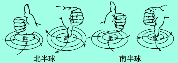 氣旋、反氣旋的低空水平氣流運(yùn)動(dòng)方向可以用左右手定則進(jìn)行判斷: