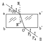 6、移去玻璃磚,在拔掉P1、P2、P3、P4的同時(shí)分別記下它們的位置,過P3、P4作直線O'B交bb'于O'。連接O、O',OO'就是玻璃磚內(nèi)折射光線的方向。∠AON為入射角,∠O'ON'為折射角。