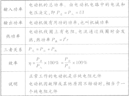(2)含有直流電動(dòng)機(jī)的電路不能簡(jiǎn)單地理解成它一定是一個(gè)非純電阻電路,要從純電阻電路和非純電阻電路在能量轉(zhuǎn)化上加以區(qū)分。直流電動(dòng)機(jī)兩端加上電壓以后,若電動(dòng)機(jī)轉(zhuǎn)動(dòng),則有電能轉(zhuǎn)化為機(jī)械能,此時(shí)的電路為非純電阻電路,部分電路的歐姆定律不再適用。若電動(dòng)機(jī)不轉(zhuǎn),則沒有電能轉(zhuǎn)化為機(jī)械能,此時(shí)損失的電能全部轉(zhuǎn)化為內(nèi)能,這時(shí)的電路是純電阻電路。因此,分析電路問題時(shí),要重視從能量的角度出發(fā),這樣會(huì)使思路清晰,解題變順利。