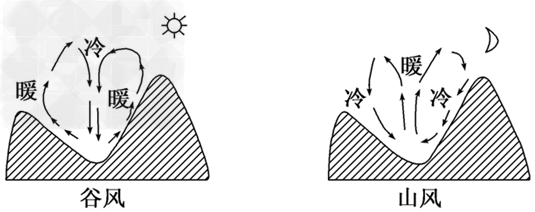 白天山坡上空增溫比谷底上空快,形成低壓,風(fēng)從谷底吹向山頂;夜晚,山坡上空降溫比谷底上空快,形成高壓,風(fēng)從山頂吹向谷底。如下圖所示: