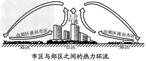 由于城市人口集中并不斷增多,工業(yè)發(fā)達(dá),居民生活和工業(yè)生產(chǎn)、交通工具消耗大量燃料,釋放出大量的人為熱量,導(dǎo)致城市氣溫高于郊區(qū),形成城市熱島。由于熱島存在,引起空氣在城市上升,在郊區(qū)下沉,在城市和郊區(qū)之間形成了小型的熱力環(huán)流,叫城市風(fēng),如下圖所示: