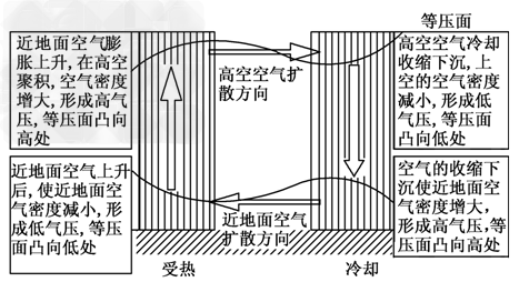 (1)同一水平面上,氣溫高的地方氣壓低,這主要取決于空氣的密度大小。氣溫高的地方空氣膨脹上升,該處空氣密度小、氣壓低;氣溫低的地方正好相反。