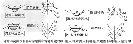 方法1:首先,作出河流兩岸的潛水流向;然后,依據(jù)潛水的流向進(jìn)行判斷。若潛水的流向向河流匯合,則潛水補(bǔ)給河水;若潛水的流向向河流分開,則河水補(bǔ)給潛水