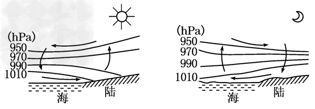 白天陸地增溫比海洋快,造成近地面的陸地氣壓低于海洋,于是風(fēng)就由海洋吹向大陸,形成海風(fēng);夜晚陸地降溫快于海洋,近地面形成高壓,風(fēng)由大陸吹向海洋,形成陸風(fēng),如下圖所示: