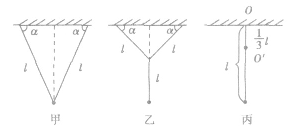 擺長是指擺動圓弧的圓心到撰球重心的距離,而不一定為擺繩的長。如圖中,擺球可視為質(zhì)點,各段繩長均為Z,甲、乙擺球做垂直紙面的小角度擺動,丙擺球在紙面內(nèi)做小角度擺動,O'為垂直紙面的釘子,而且