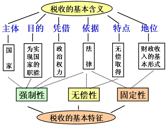 ③固定性(國(guó)家在征稅之前就以法律的形式,預(yù)先規(guī)定了征稅對(duì)象和稅率,不經(jīng)國(guó)家有關(guān)部門批轉(zhuǎn)不能隨意改變)。三個(gè)基本特征的關(guān)系:稅收的無(wú)償性要求它具有強(qiáng)制性,強(qiáng)制性是無(wú)償性的保障;稅收的強(qiáng)制性和無(wú)償性又決定了它必須具有固定性。