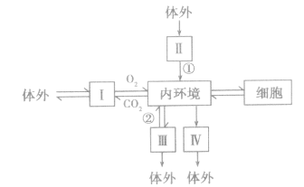 I是體內(nèi)外進(jìn)行物質(zhì)交換的系統(tǒng),并能為內(nèi)環(huán)境提供02并排出CO2,這說明I是呼吸系統(tǒng),內(nèi)環(huán)境與 I交換氣體必須通過肺泡壁和毛細(xì)血管壁;如果Ⅱ內(nèi)的葡萄糖通過①只能進(jìn)入血液,那么Ⅱ為消化道,①表示主動運(yùn)輸;Ⅲ是泌尿系統(tǒng),②表示重吸收作用;皮膚有保護(hù)的作崩,皮膚中的汗腺通過分泌汗液來排出代謝廢物,Ⅳ表示的器官是皮膚。