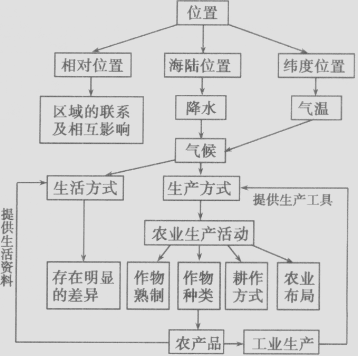 (3)整體性,即組成區(qū)域的各要素間相互聯(lián)系、相互影響、相互制約的關(guān)系。圖示如下: