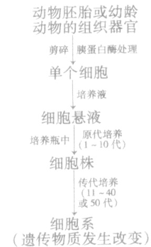 取動(dòng)物組織塊(動(dòng)物胚胎或幼齡動(dòng)物的器官或組織)→剪碎→用胰蛋白酶或膠原蛋白酶處理分散成單個(gè)細(xì)胞→制成細(xì)胞懸液→轉(zhuǎn)入培養(yǎng)瓶中進(jìn)行原代培養(yǎng)→貼滿瓶壁的細(xì)胞重新用胰蛋白酶或膠原蛋白酶處理分散成單個(gè)細(xì)胞繼續(xù)傳代培養(yǎng)。