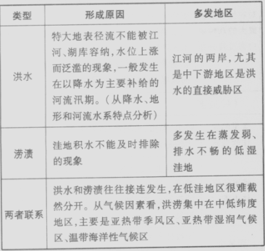 暴雨洪水 | 主要有臺風(fēng)、鋒面等帶來的暴雨 | 東部季風(fēng)區(qū)各大江河的中下游平原 | 時間上與暴雨時間存在高度一致性,在東部季風(fēng)區(qū),暴雨集中發(fā)生在每年的4?9月,自南向北推移 |